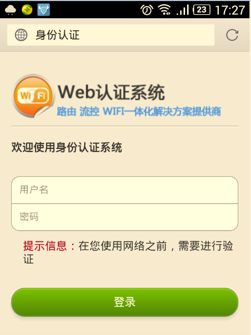 用(yòng)戶手機(jī)連接wifi後,打開(kāi)任意浏覽器(qì),手機(jī)浏覽器(qì)會(huì)自(zì)動彈出認證界面: