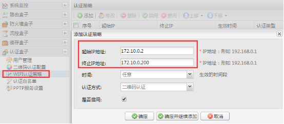 此處的(de)認證策略設置的(de)起始IP地(dì)址-終止IP地(dì)址意義為(wèi),當手機(jī)連接WIFI獲取到(dào)的(de)IP地(dì)址在此範圍內(nèi)的(de•)都(dōu)需要(yào)認證後才能(néng)正常上(shàng)網,所以一(yī)般設置起始IP地(dì)址和(hé)終止IP地©(dì)址範圍,為(wèi)DHCP分(fēn)配的(de)範圍。